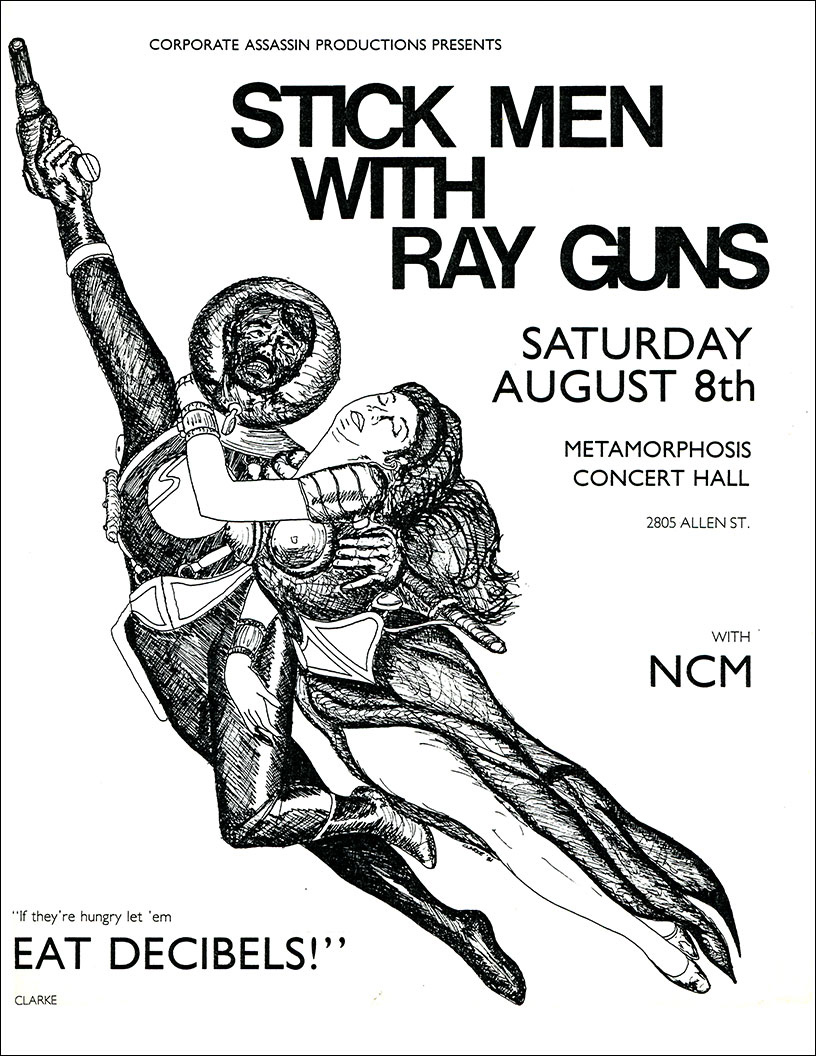 Stick Men With Ray Guns (SMWRG) formed in Dallas, Texas, in the spring of 1981 with Clarke Blacker on guitar (ex-Nervebreakers & Bag of Wire), Bobby Soxx on vocals (ex-Teenage Queers & the Enemy) and Ft. Worth drummer Scott Elam. We were active through January, 1987 when we took a break to work on other things. SMWRG reformed in 1988, playing a few shows in Dallas and around the state before breaking up for good in the summer of 1988.